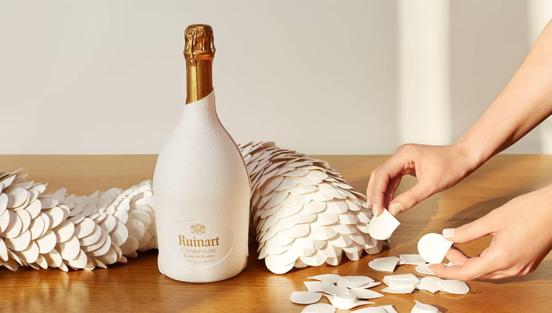 Commissionnée par Ruinart pour recycler les étuis seconde peau existants et leur donner une utilisation à vie, l'artiste a réalisé un travail minutieux de sculpture, sublimant l'écrin en créant une troisième peau Blanc de Blancs. Ce travail manuel fait ressortir une délicatesse qui reflète le champagne, depuis sa production avec le soin apporté aux vignes jusqu'à sa dégustation avec la finesse de ses bulles.