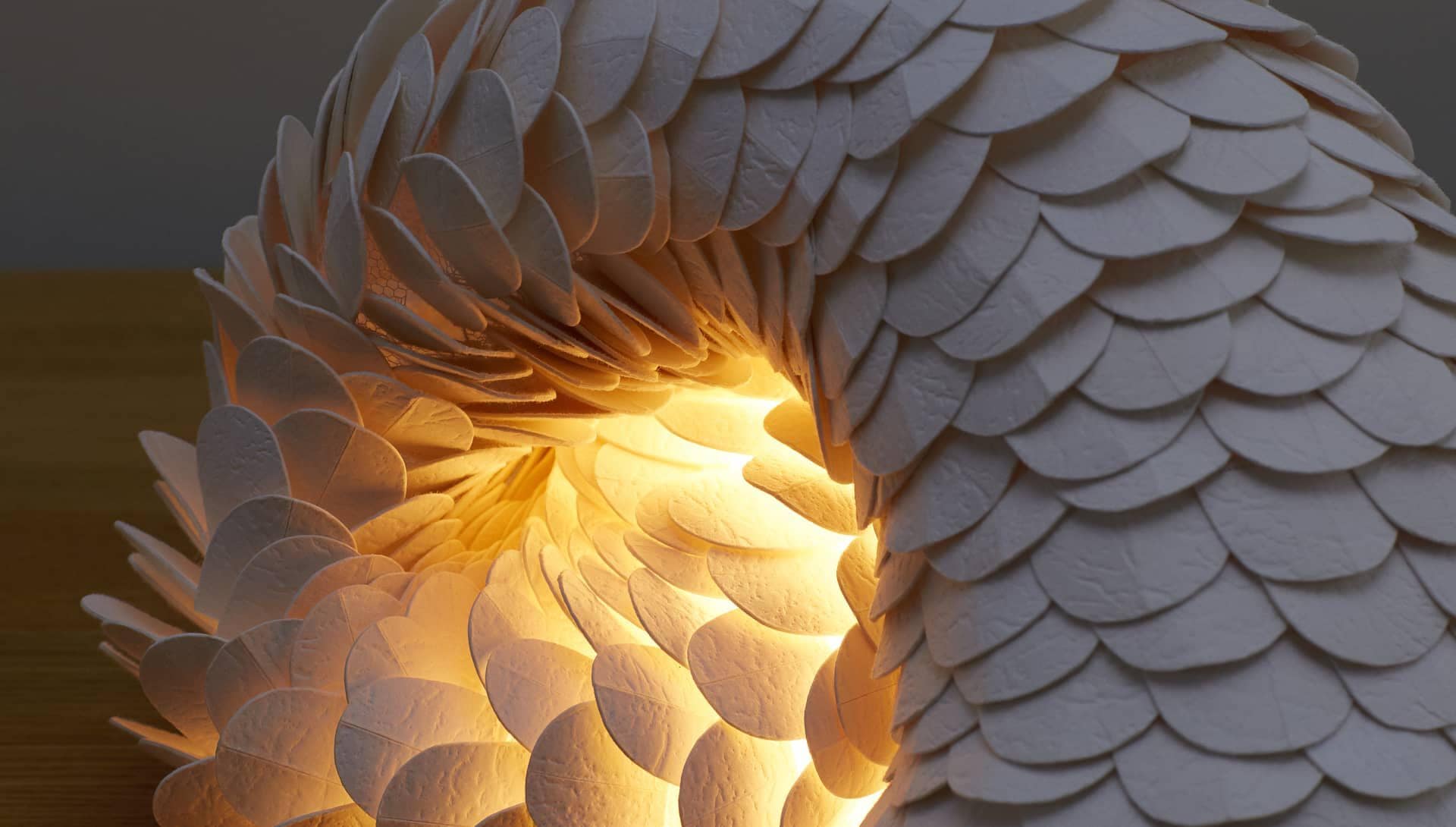 L'artiste et artisane française a méticuleusement sculpté l'étui seconde peau pour le recycler et le sublimer. Elle a d'abord dessiné les formes des écailles sur l'étui en papier, puis les a découpées, pour enfin coudre les pièces une à une pour les assembler. S'inspirant des fibres naturelles, des couleurs blanches et dorées, de la sobriété et de la finesse de l'étui seconde peau, Anne-Charlotte cherche à stimuler nos sens et nous invite à donner libre cours à notre imagination pour interpréter son travail.